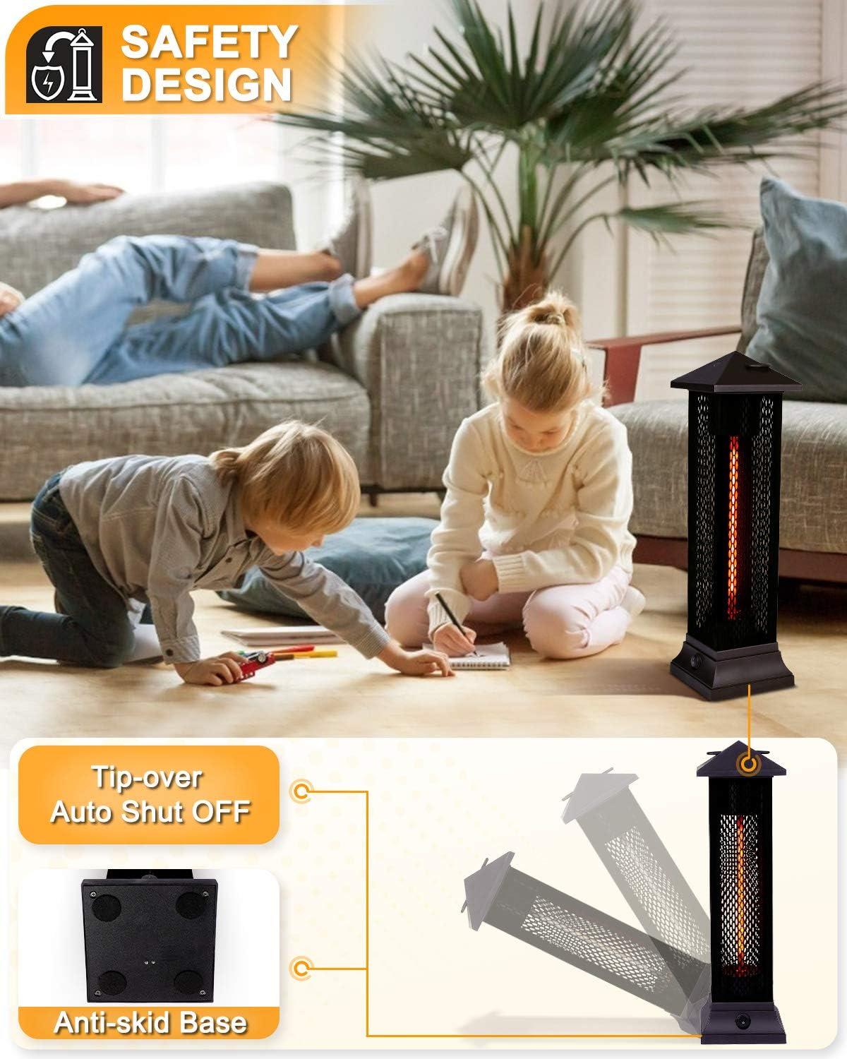 This tall electric heater is constructed from steel and aluminum which makes it sturdy and durable.
